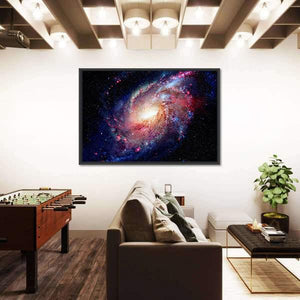 This captivating canvas art features a stunning spiral galaxy, complete with a glowing central core and vibrant nebulae in shades of blue, pink, and purple. It's an awe-inspiring portrayal of the cosmos that adds a touch of mystery and vibrancy to any space.