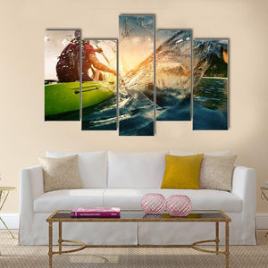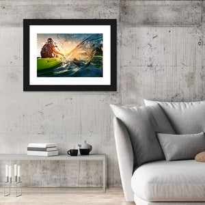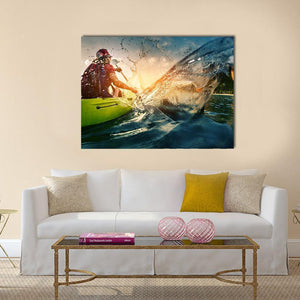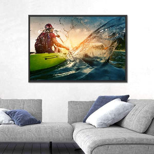 This vibrant canvas art captures a kayaker navigating through dynamic water splashes under bright sunlight. The energetic scene, highlighted by a striking blue and green palette, brings a refreshing touch to any nature-inspired decor.