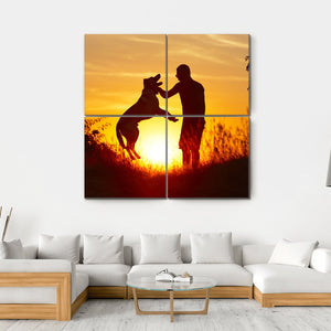 This vibrant canvas art captures a joyful moment between a young man and his yellow Labrador retriever against a warm sunset backdrop. The silhouette style, with its energetic feel and rich colors of orange and yellow, adds a cheerful touch to any space.