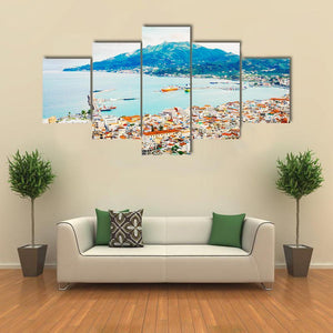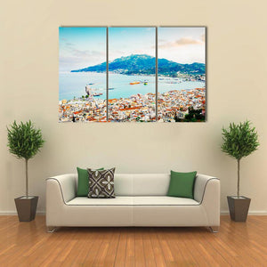 This canvas captures an aerial view of a coastal Greek town and its Ionian Sea harbour, showing red tile roofs, white buildings, clear blue water and a large green mountain. The image feels vibrant, sunny and peaceful and suits coastal or modern room decor.