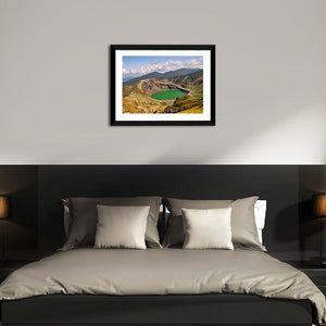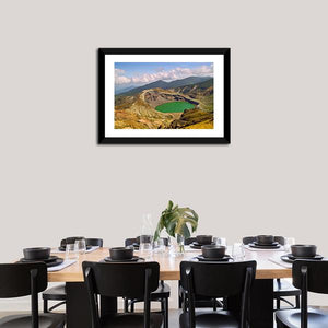 This canvas art captures a breathtaking high-angle view of a volcanic crater and its vibrant green lake. Surrounded by layered mountains and a serene sky dotted with puffy clouds, the scene evokes a majestic connection with nature.