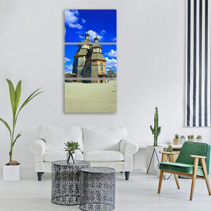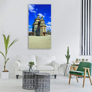 A photorealistic canvas of a two-tiered wooden church with multiple domes beneath a bright blue sky and soft clouds. The rule-of-thirds composition and a palette of blue, brown, tan, and white create a clear, open, and bright mood. Good for modern living rooms, hallways, or entryways that welcome architectural or place-based art.
