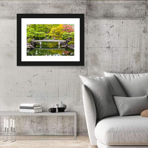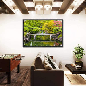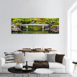 A photorealistic panoramic canvas showing a Japanese zen garden with a stone bridge, reflective pond, rocks and lush trees. The calm green, brown and gray palette creates a serene, natural mood that suits modern interiors and quiet living spaces.