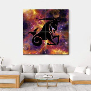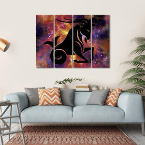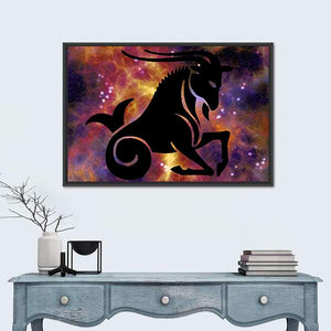This canvas art features the Capricorn zodiac symbol, showcasing a powerful silhouette of a mythical sea-goat. With a mystical palette of black, purple, orange, and yellow, it adds a cosmic touch to your wall decor.