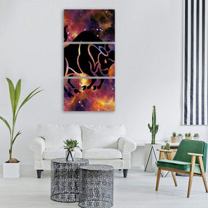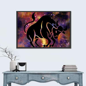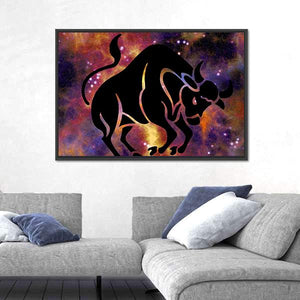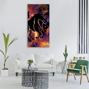 Centered on a bold Taurus zodiac silhouette, this canvas pairs a glowing outline and an implied constellation with stars and a swirling nebula. Black, purple, orange, yellow and white tones create a cosmic, powerful, and mystical atmosphere, well-suited to modern or astrology-inspired rooms.