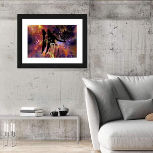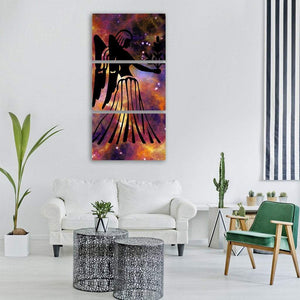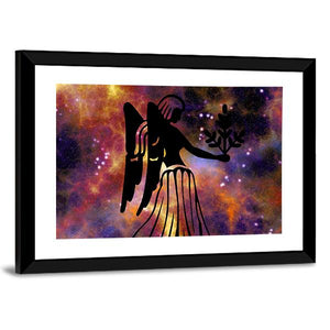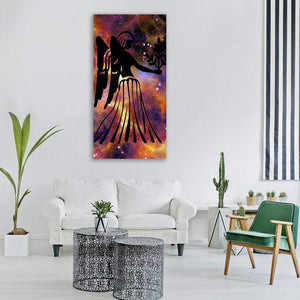This Virgo zodiac canvas features a centered angelic silhouette in black—wings and a flowing dress—holding a sprig with leaves against a vibrant nebula of purple, orange, gold and white dotted with stars. The modern, abstract image reads as mystical, celestial, and elegant, and suits modern interiors or astrology-themed wall decor.