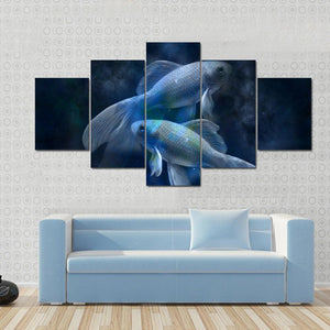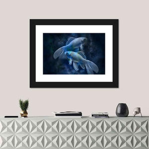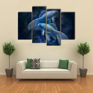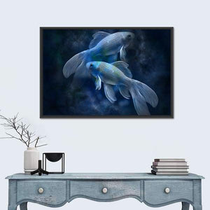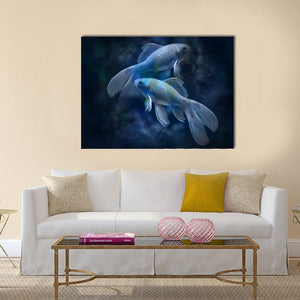 Two goldfish glide through a dark, cloudy underwater scene rendered in blue, black, white and green, giving the piece a tranquil, ethereal, mystical atmosphere. The modern, surreal composition emphasizes depth and rule-of-thirds balance, making it a calm focal point for contemporary living rooms or bedrooms.