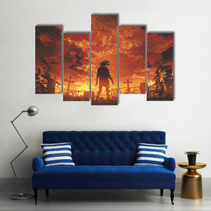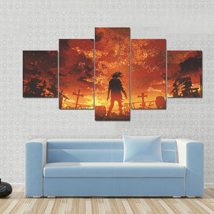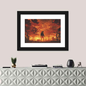 This "Zombie In The Burnt Cemetery" canvas wall art captures a haunting scene of a lone zombie wandering through a charred graveyard beneath a fiery sky. Expertly crafted, this striking piece evokes a powerful atmosphere that blends eerie mystery with dramatic intensity. Ideal for art enthusiasts or anyone seeking a bold statement piece, it adds a captivating and thought-provoking element to any room’s decor.