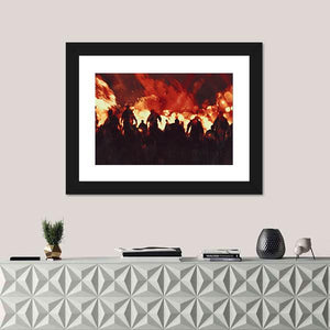 This striking canvas features silhouettes of figures amid swirling fire and smoke. With an intense palette of red, orange, and black, it evokes a dramatic, chaotic atmosphere that captures the imagination. Ideal for adding a bold touch to modern wall decor.