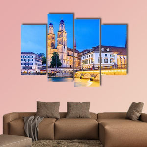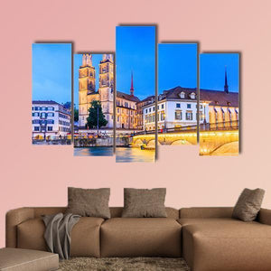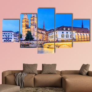 Zurich View In Switzerland Canvas Wall Art captures a tranquil cityscape with the cathedral’s twin spires, an arched bridge, river reflections and surrounding buildings. Rendered in a realistic style with a blue, yellow, beige and white palette and soft evening light, it suits living rooms or modern interiors seeking a historic, atmospheric scene.